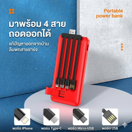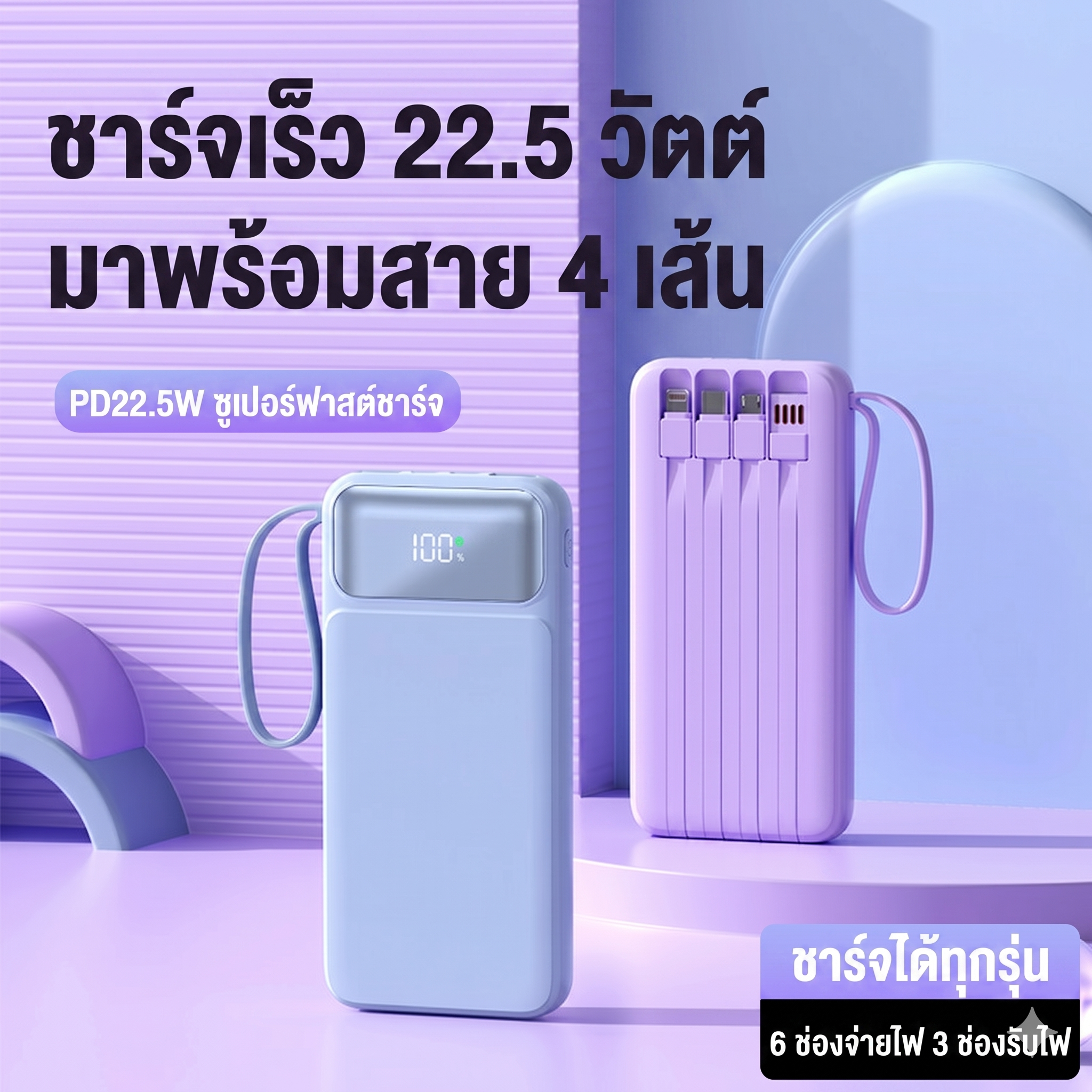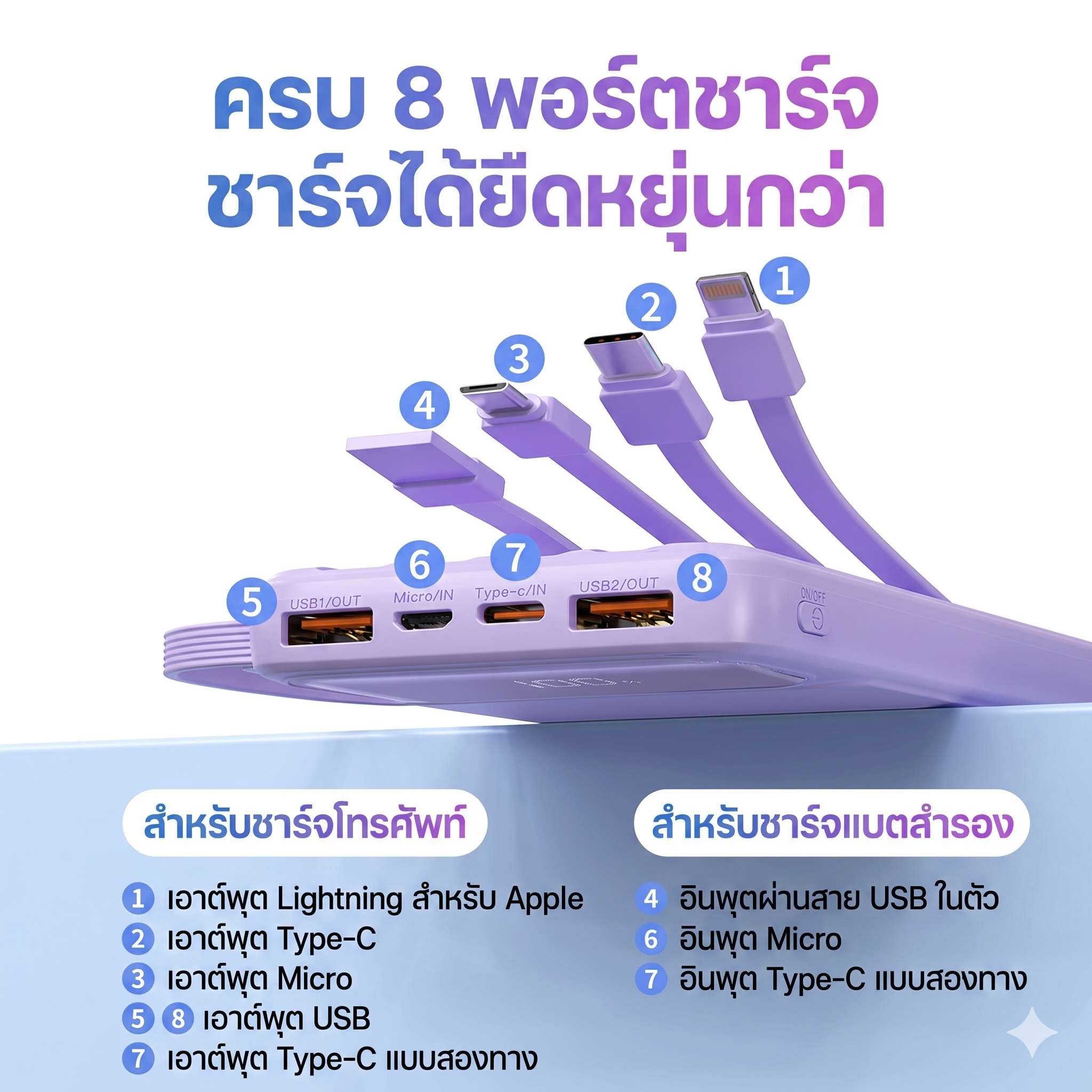 สำหรับชาร์จอุปกรณ์: สาย Type-C , สาย Lightning , สาย Micro USB , สาย USB-A