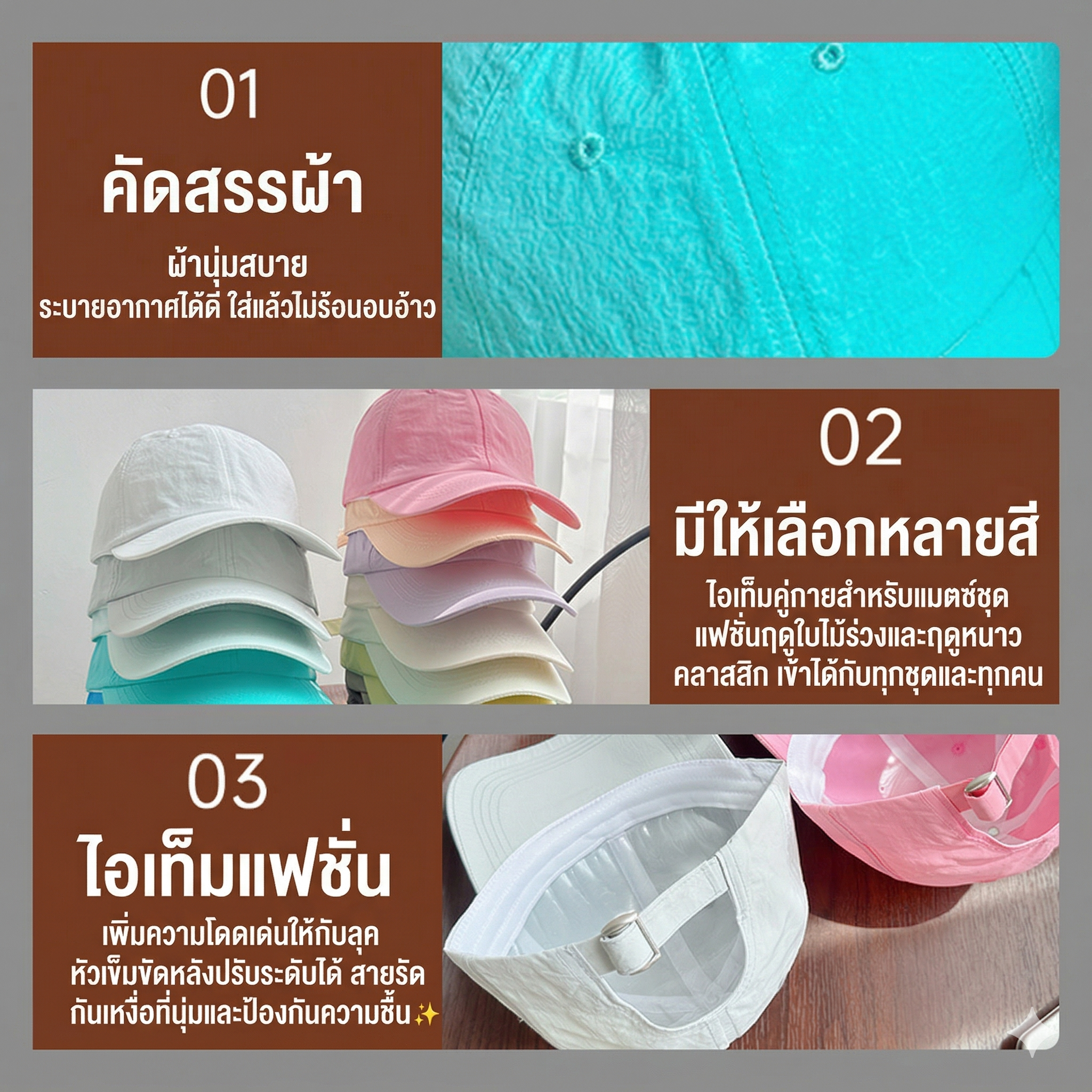• เลือกประเภทของหมวก (หมวกแก๊ป / หมวกทรงสปอร์ต / หมวกแฟชั่น)