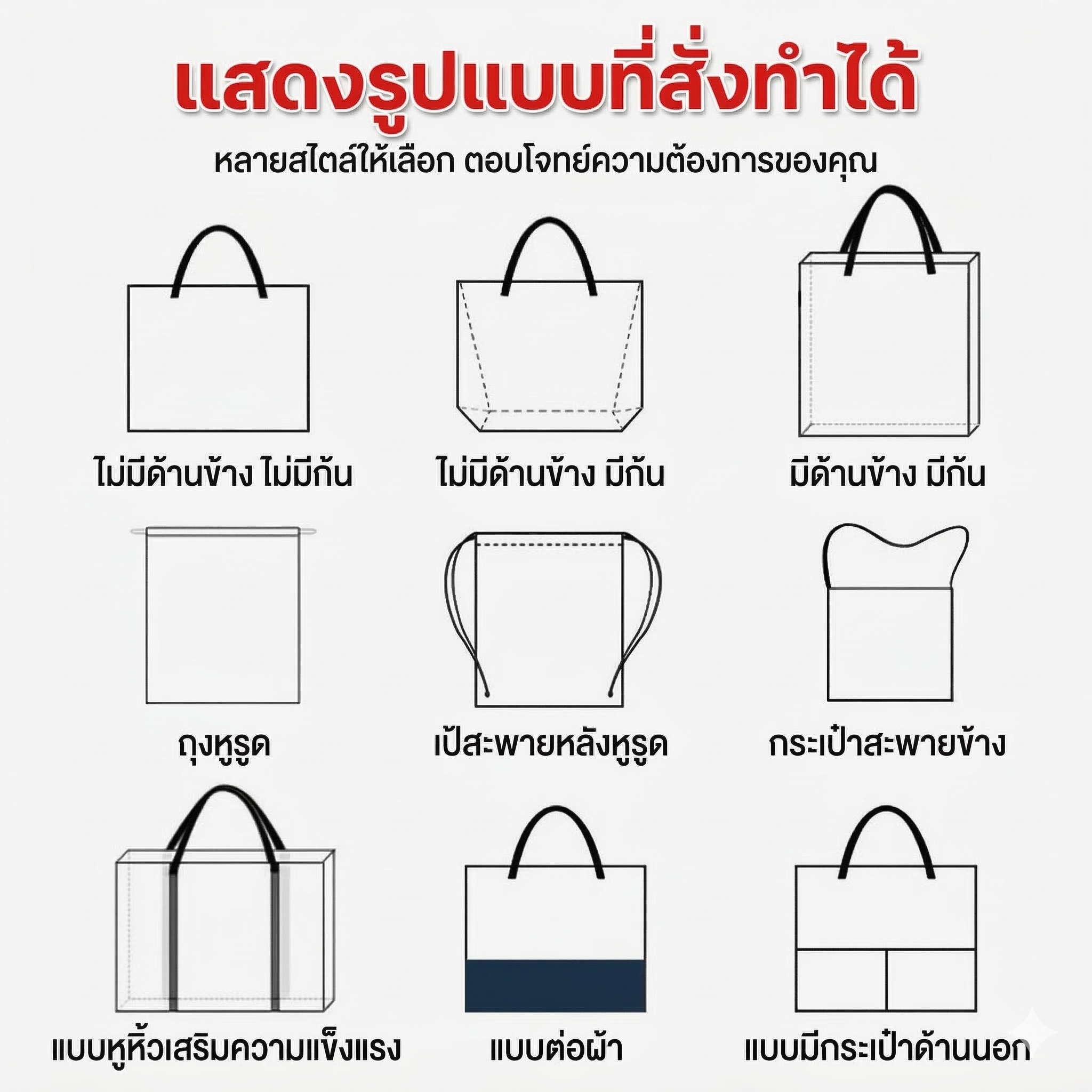 รูปแบบการพิมพ์: สกรีน (Silk Screen) / พิมพ์รีดร้อน (Heat Transfer) / พิมพ์แบบเคลือบฟิล์ม (Lamination Printing)