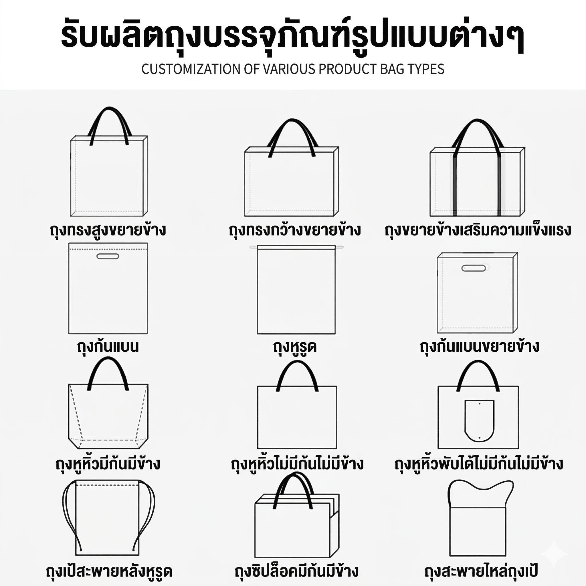 • เลือกวัสดุของถุง (ผ้าไม่ทอ / ผ้าแคนวาส / ผ้าออกซ์ฟอร์ด / PVC)